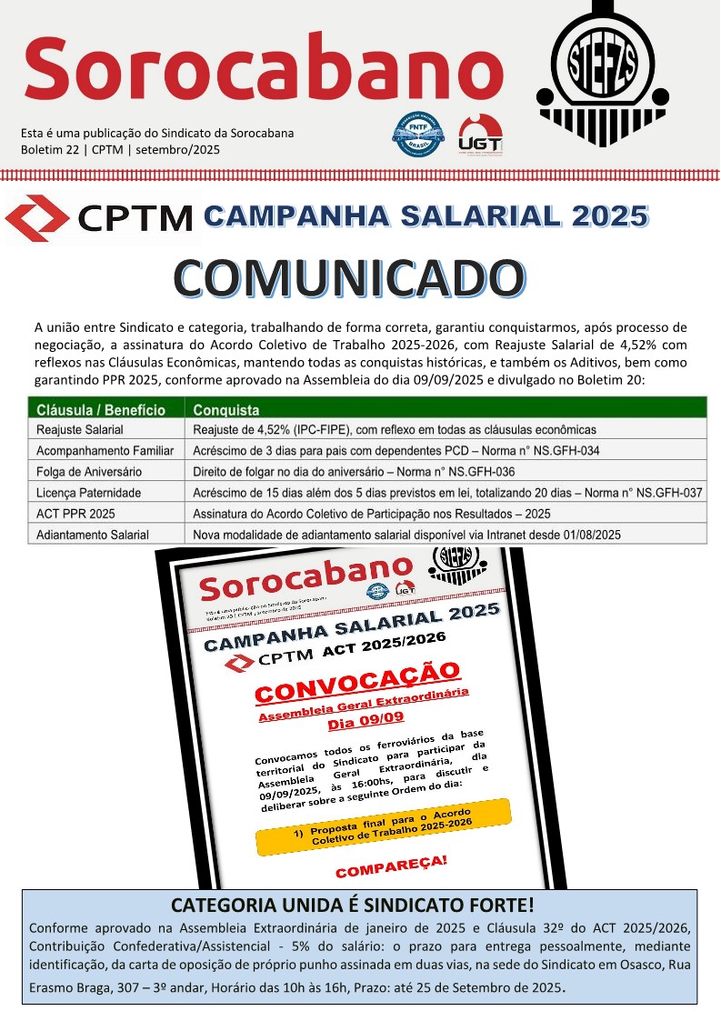 A união entre o Sindicato e a categoria, atuando de forma firme e correta, garantiu a conquista da assinatura do Acordo Coletivo de Trabalho 2025-2026, referente à data-base de março de 2025, com reajuste salarial de 4,52% (IPC-FIPE), com reflexos em todas as cláusulas econômicas, mantendo todas as conquistas históricas e aditivos, além de assegurar o PPR 2025, conforme aprovado na Assembleia do dia 09/09/2025. Entre os principais avanços conquistados estão o acréscimo de 3 dias de folga para pais com dependentes PCD, o direito de folgar no dia do aniversário, a ampliação da licença paternidade para 20 dias (5 previstos em lei mais 15 adicionais), a assinatura do Acordo Coletivo de Participação nos Resultados 2025 e a disponibilização de uma nova modalidade de adiantamento salarial via Intranet desde 01/08/2025.
